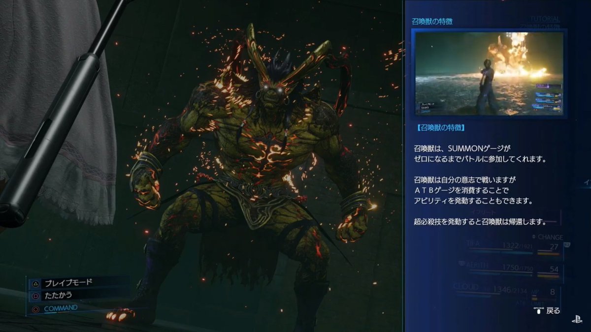 ライブの中で北瀬氏は、メニュー画面を初公開。 オリジナルのFF7のようにプレイ出来る「クラシックモード」や、ミニゲーム「スクワット」、召喚獣「イフリート」を召喚して、デモプレイ。 システムもわかり易く面白そうですが、バレットとの会話や、召喚獣との共闘、各キャラの必殺技などなど、作り込みの度合いがハンパ無いです! 是非プレイ動画でご確認を!