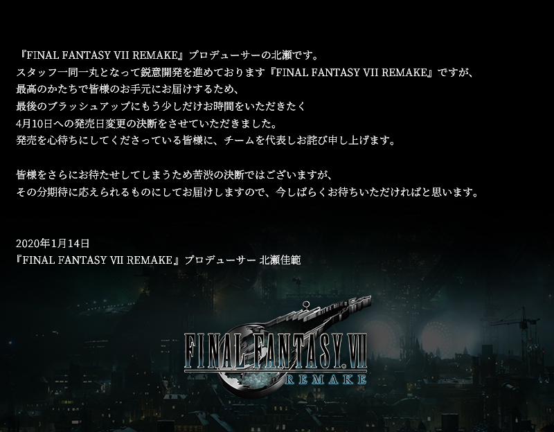 発売をお待ちいただいている皆様には大変ご迷惑をおかけいたしますことを、深くお詫び申し上げます。#FF7R pic.twitter.com/4QNWn6VoqJ— FFVII REMAKE (@FFVIIR_CLOUD) January 14, 2020