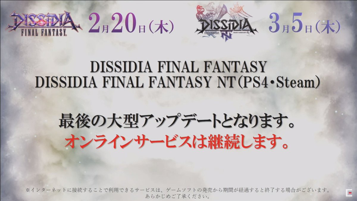 2/18に行われた、「DFFアーケード&NT合同公式生放送 ~2月アップデート特集~」より、放送の冒頭にて間氏・鯨岡氏より大事なお知らせがあるとの事で、間氏「次回アップデートを持って大型アップデートを終了。オンラインサービスは継続します」鯨岡氏「現状”DFF2”の予定はありません」との説明がされました。以下、冒頭の説明詳細より